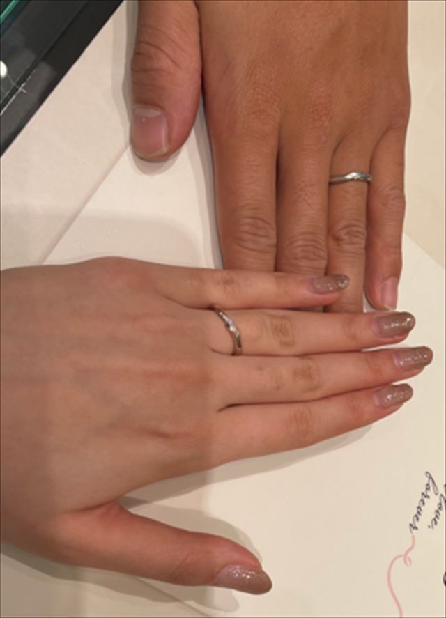 私の最初の思いではシンプルなストレートの指輪を検討していましたが、実際に店舗で試着するとストレートよりウェーブのほうがしっくりくる感じがありました。なので実際に店員さんやプロの方に付けた感じをみてもらってアドバイスをもらえるような機会があるととても参考になると思います。また郵送でのアフターサービスもあると思いますが、安心の面では実際に足を運べる店舗があるほうが気軽に伺えて、お掃除などのメンテナンスもすぐに受けられるのでいいと思いました。